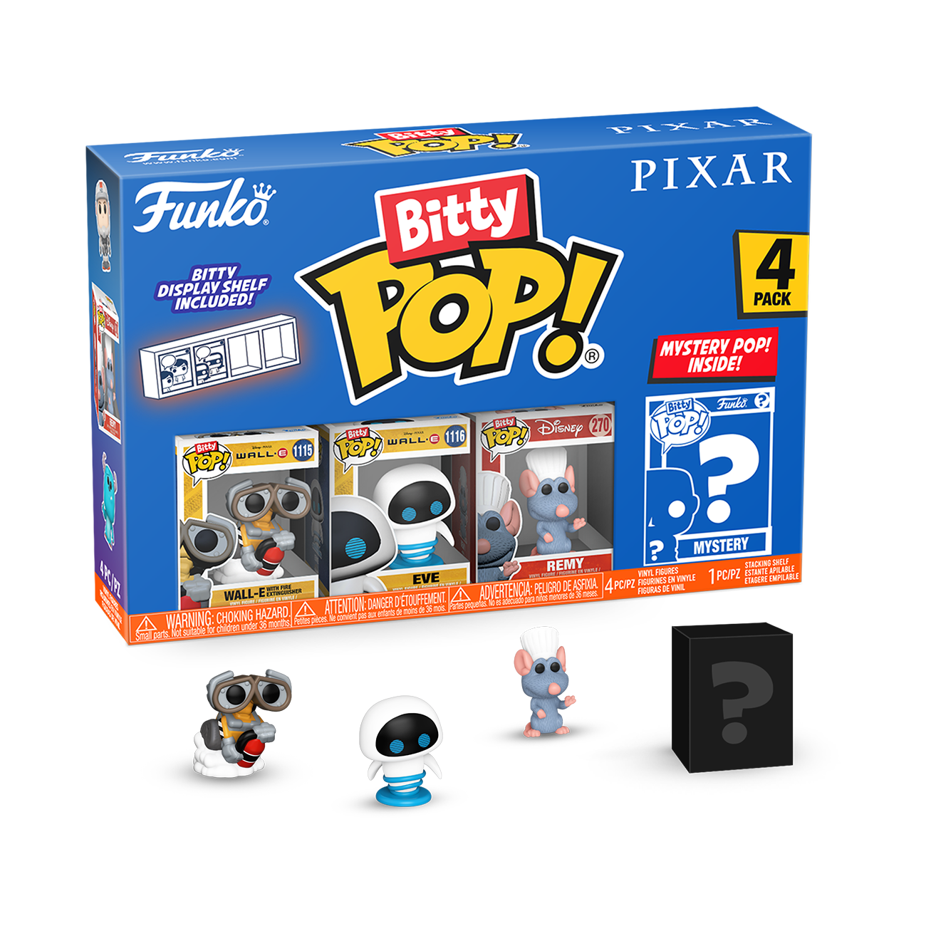 Your favorite Pops! have been shrunk into Bitty POP! collectibles! Expand your Disney Pixar collection with this assortment of Bitty POP! figures featuring your most beloved animated characters! This 4-pack includes Bitty POP! WALL-E with Fire Extinguisher, Bitty POP! EVE, Bitty POP! Remy, and a mystery Bitty POP! figure. The possible mystery Bitty POP! collectibles are Hyper Rare (1/6) Meilin Lee, Hyper Rare (1/6) Alfredo Linguini, Rare (1/3) Dory, and Rare (1/3) Joy.