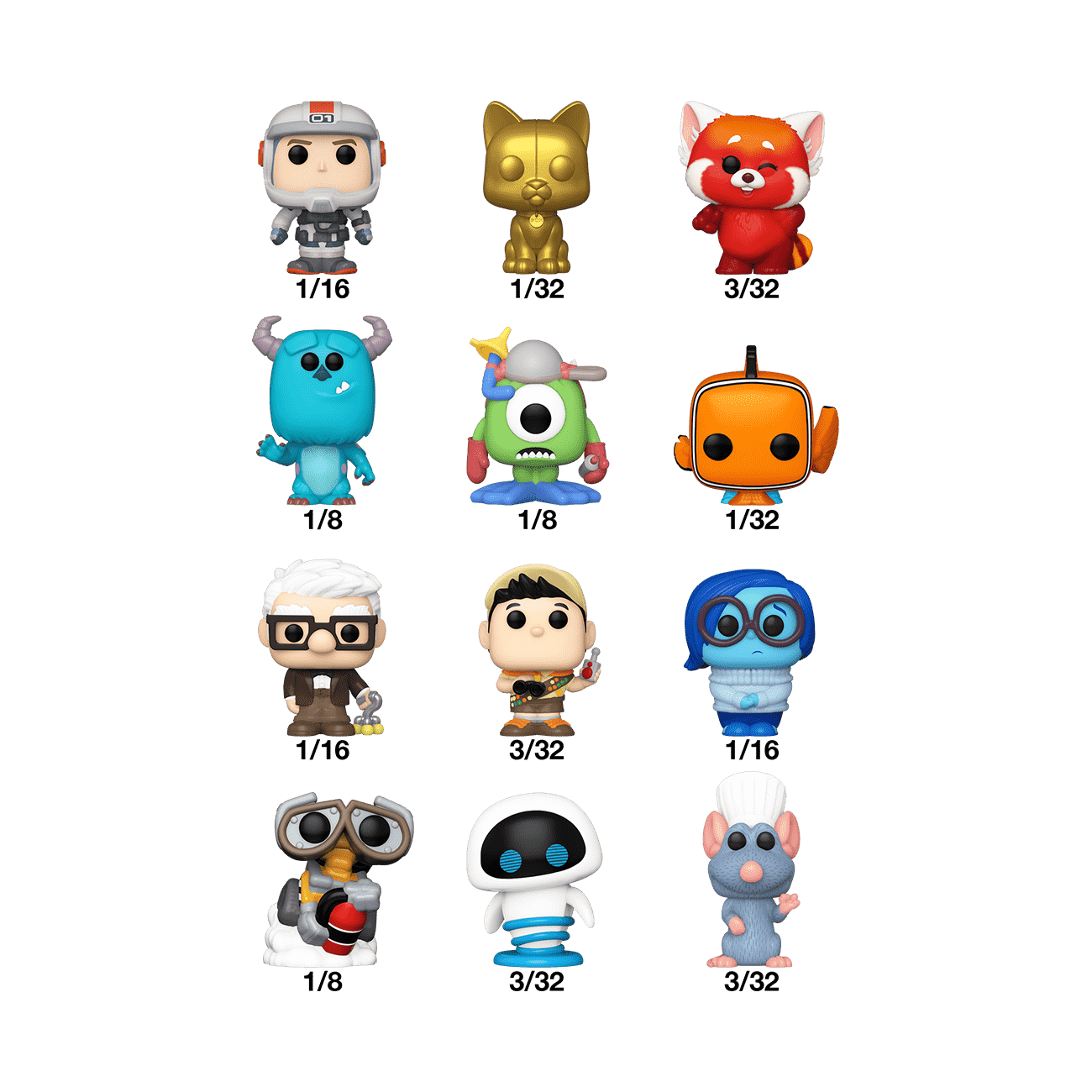 Your favorite Pops! have been shrunk into Bitty POP! collectibles! Expand your Disney Pixar collection with this assortment of Bitty POP! figures featuring your most beloved animated characters! Each Bitty POP! comes in mystery packaging and includes one collectible figure. Who will you find? There’s Bitty POP! Buzz Lightyear (1/16), Bitty POP! Sox Gold (1/32), Bitty POP! Red Panda Mei (3/32), Bitty POP! Sully (1/8), Bitty POP! Mike Wazowski (1/8), Bitty POP! Nemo (1/32), Bitty POP! Carl (1/16), Bitty POP! Russell (3/32), Bitty POP! Sadness (1/16), Bitty POP! WALL-E (1/8), Bitty POP! EVE (3/32), and Bitty POP! Remy (3/32).
