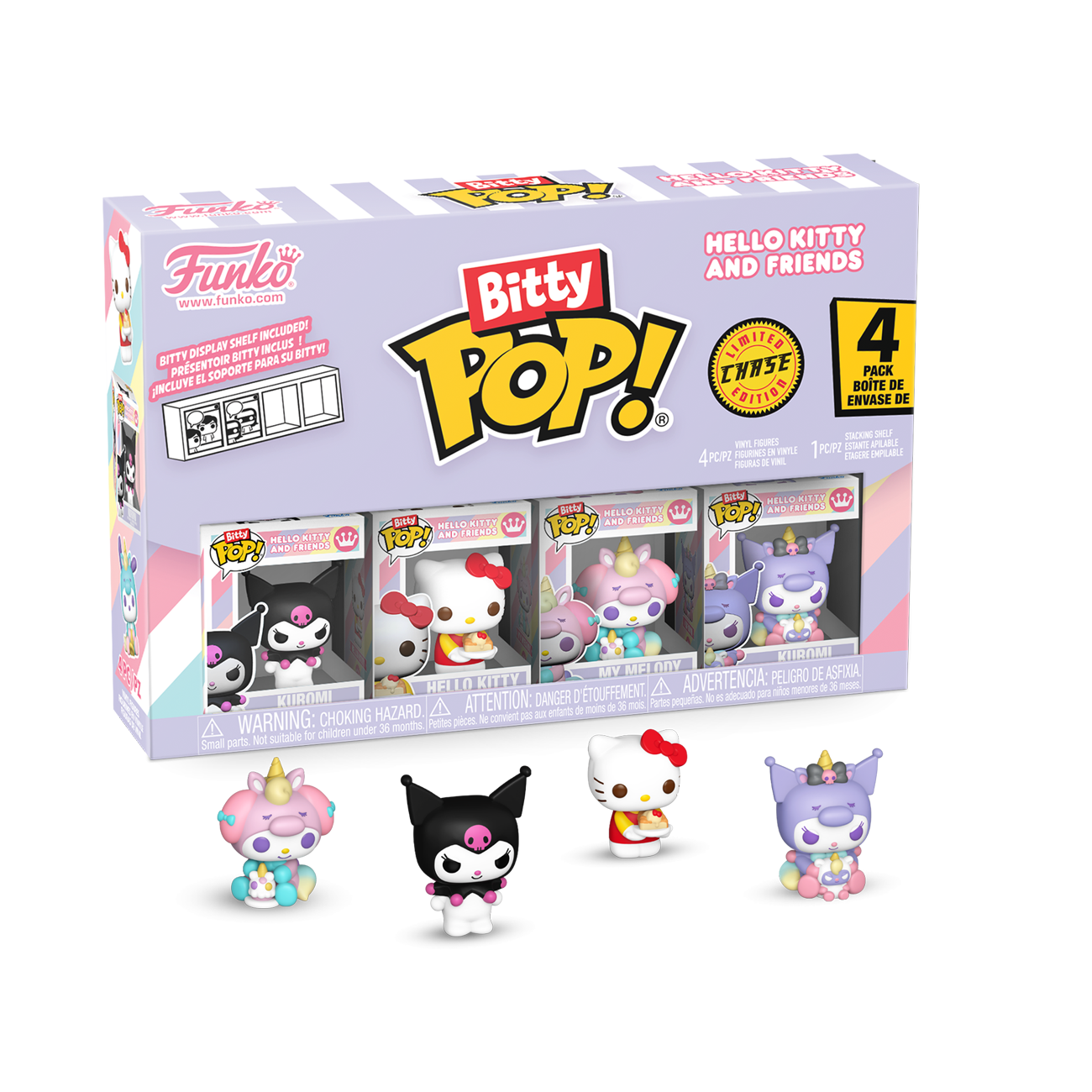 The world of POP! is getting bigger—and smaller—with Bitty POP! collectibles! Expand your Sanrio® Hello Kitty® and Friends collection with this 4-pack featuring Bitty POP! Kuromi®, Bitty POP! Hello Kitty® – Dessert, Bitty POP! My Melody® – Unicorn, and a chase Bitty POP! collectible. The possible chase Bitty POP! collectibles are Rare (1/3) Tuxedosam®, Rare (1/3) Chococat®, Hyper Rare (1/6) Kuromi® – Unicorn, and Hyper Rare (1/6) Hello Kitty® – Glasses.