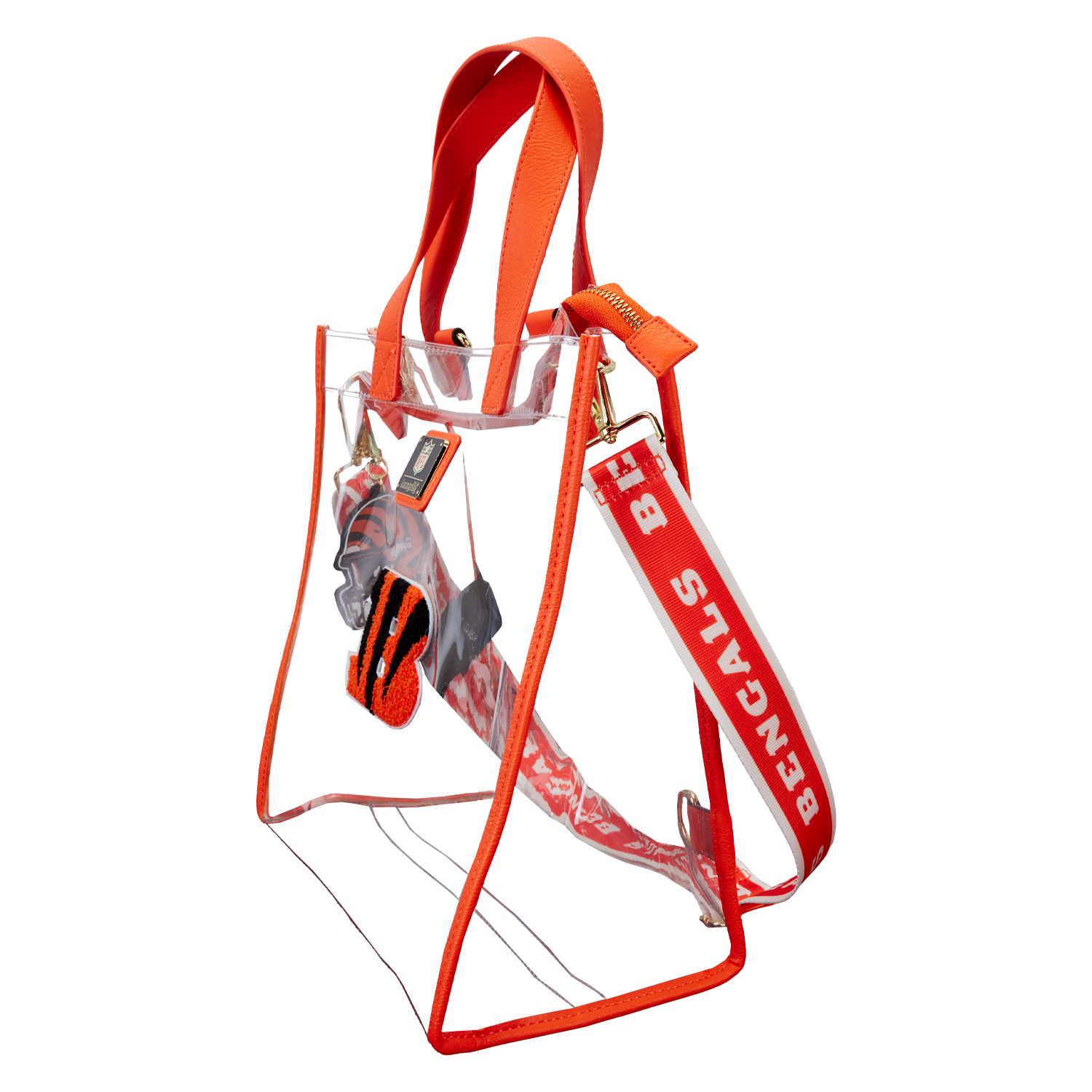 Feeling game-day ready? Cheer on your favorite football team with this convertible tote bag! The clear design makes it easy to bring your belongings into the stadium, and versatile shoulder straps help to keep your bag close as you wander the crowds. A chenille patch of the Bengals logo, a helmet-shaped bag charm, and coordinating team colors give this bag an elevated look. No need to sacrifice your style at the big game – this accessory is the perfect combination of fashion and function.
