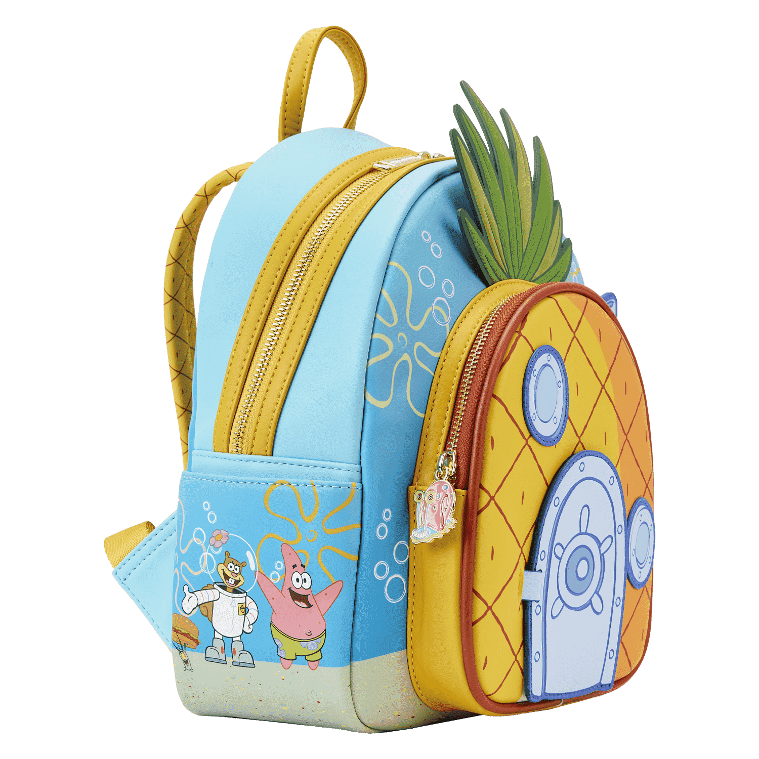 The Loungefly SpongeBob SquarePants Pineapple House Mini Backpack is made of vegan leather (polyurethane). Bag has adjustable shoulder straps and sturdy metal hardware. Additional features include applique, debossed, and printed details. Take note of the coordinating inside lining.