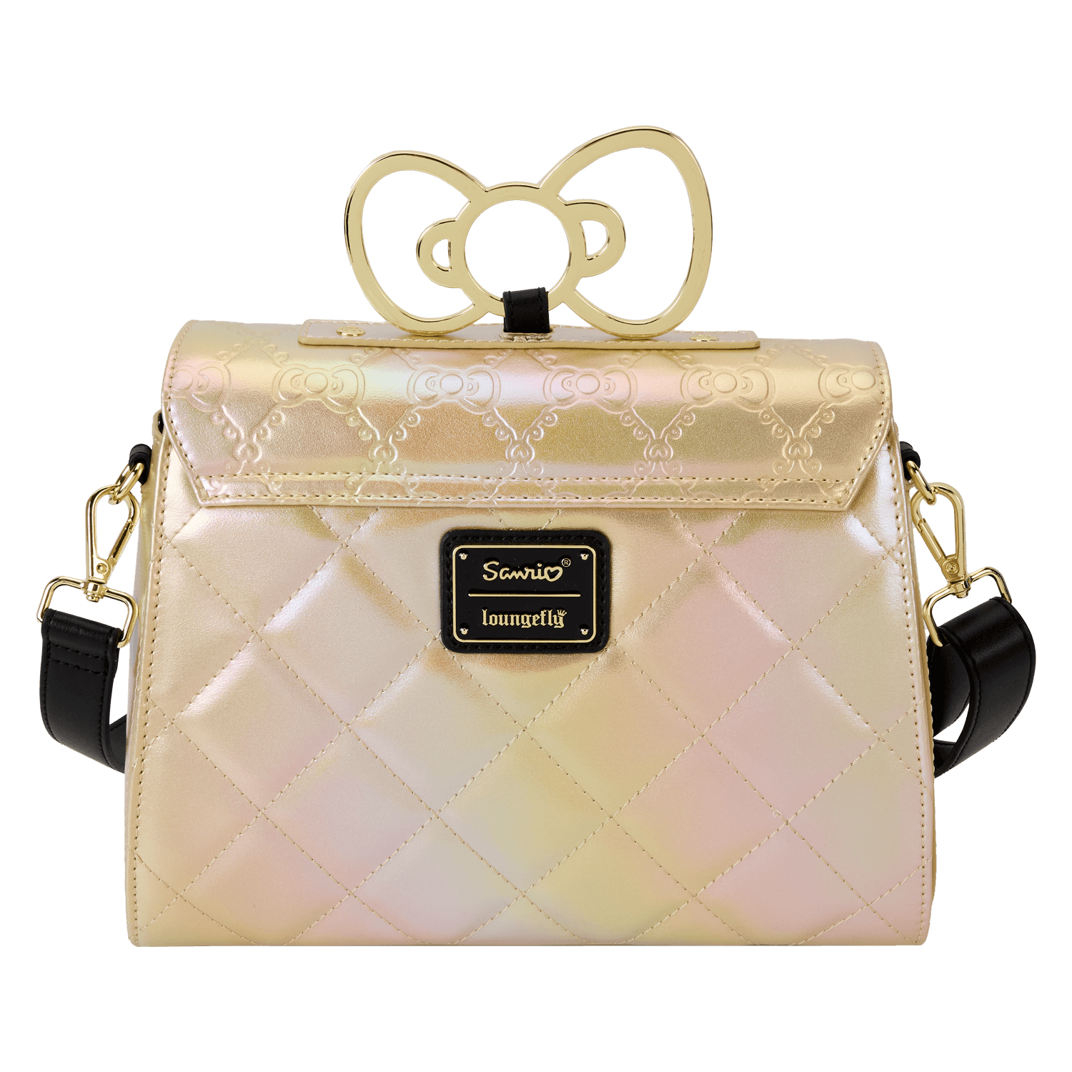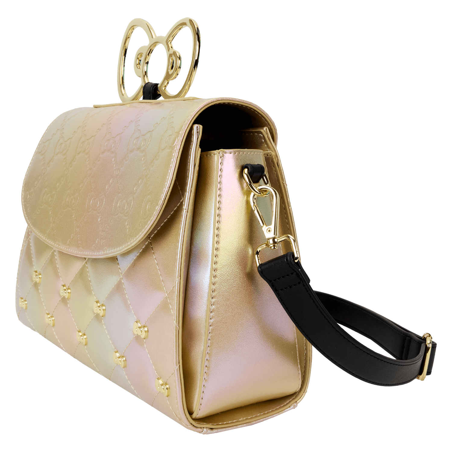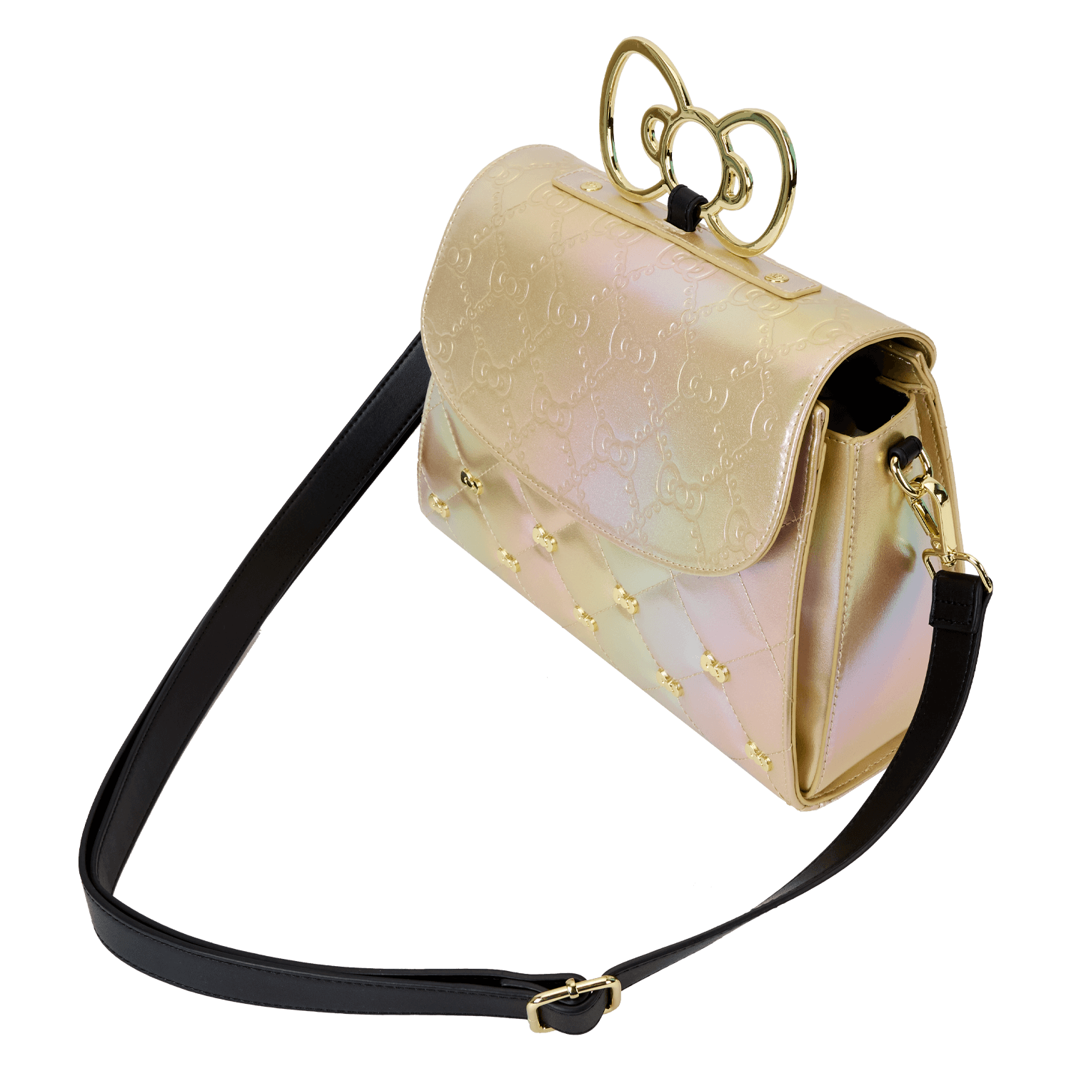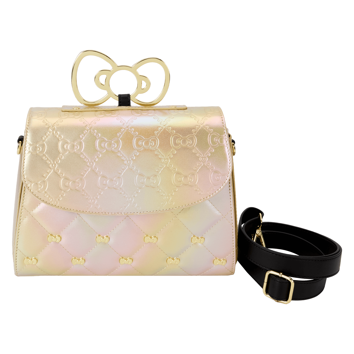 This pop icon is celebrating 50 years of timeless style! Look to the future with Hello Kitty as she commemorates her golden anniversary. With a metallic debossed design, a molded metal handle, and bow-shaped rivets, this crossbody bag makes an elevated statement piece for any outfit.