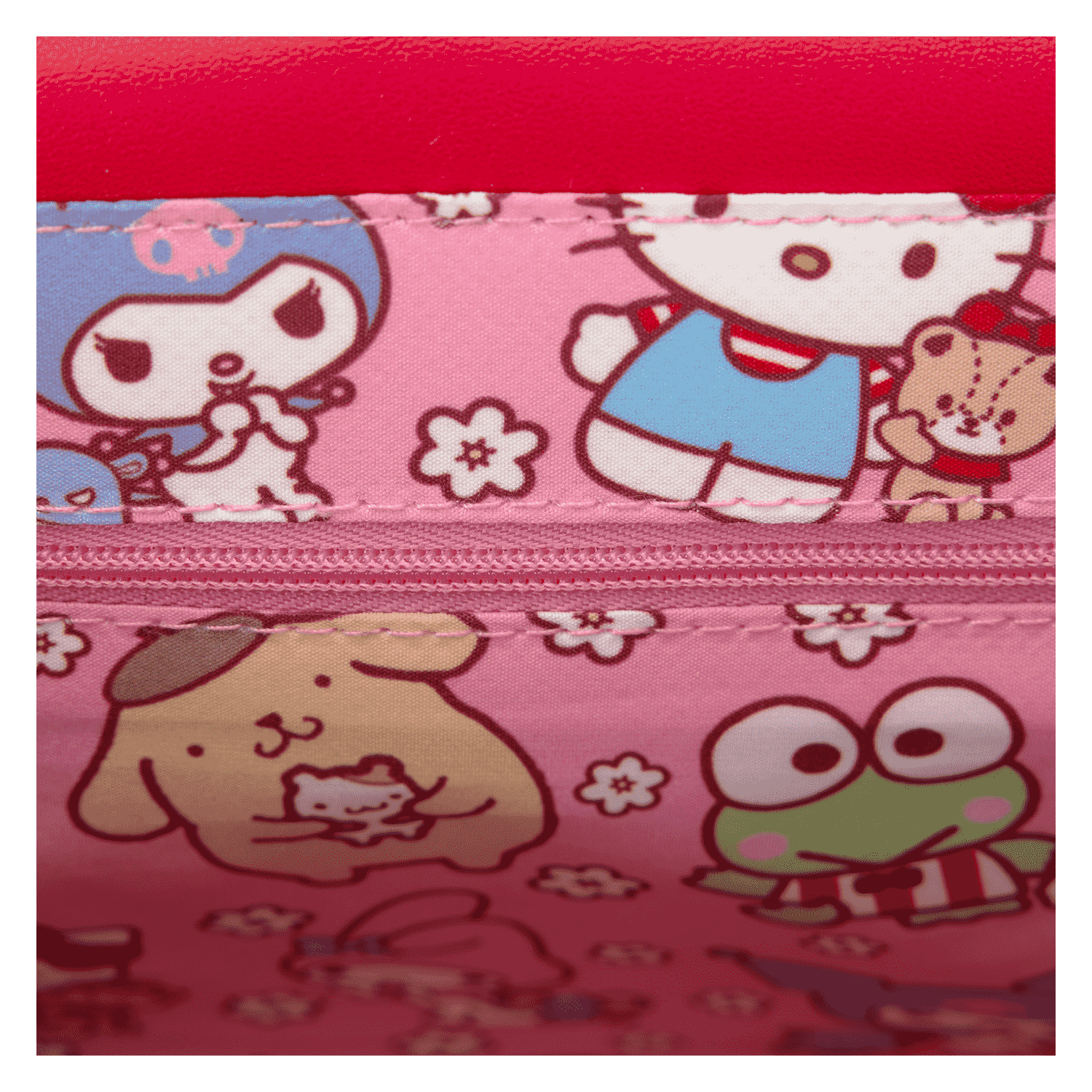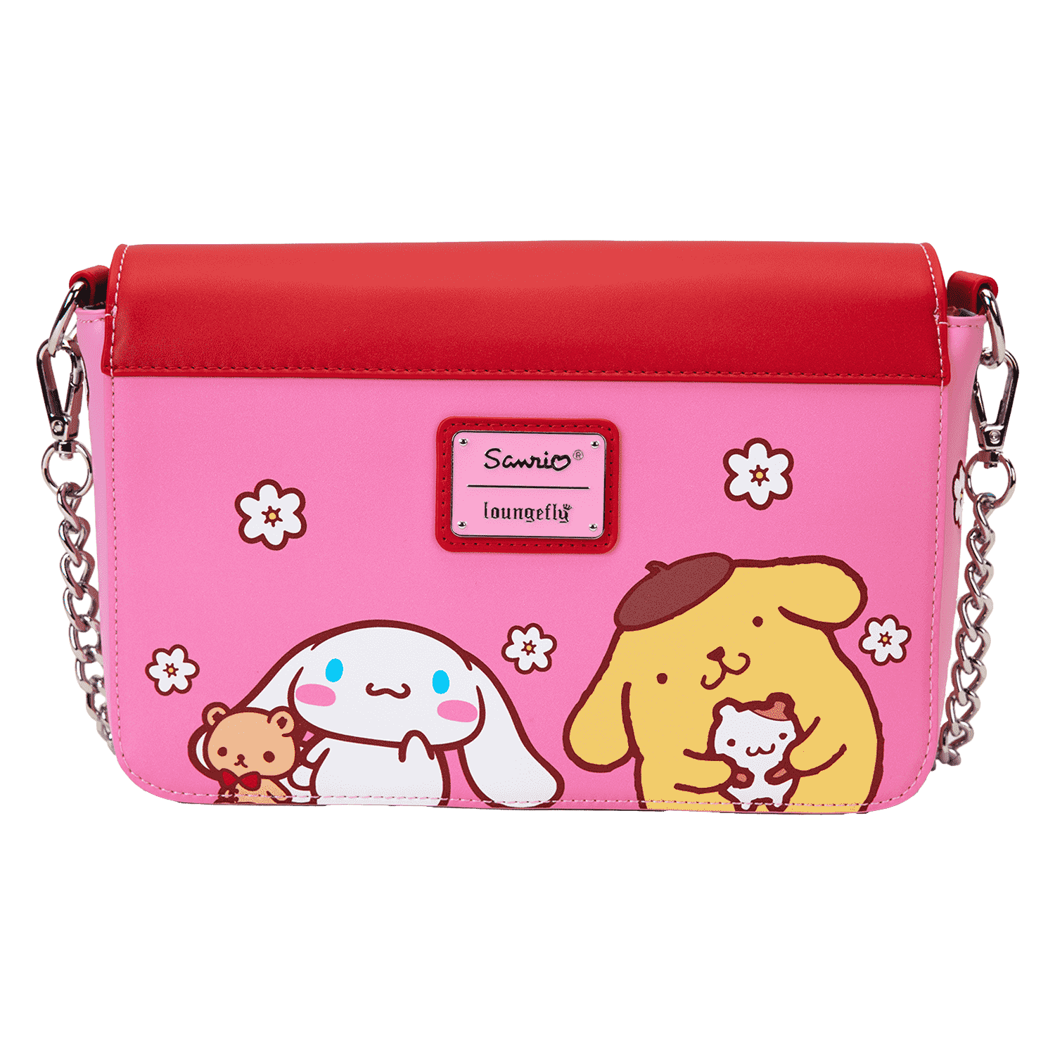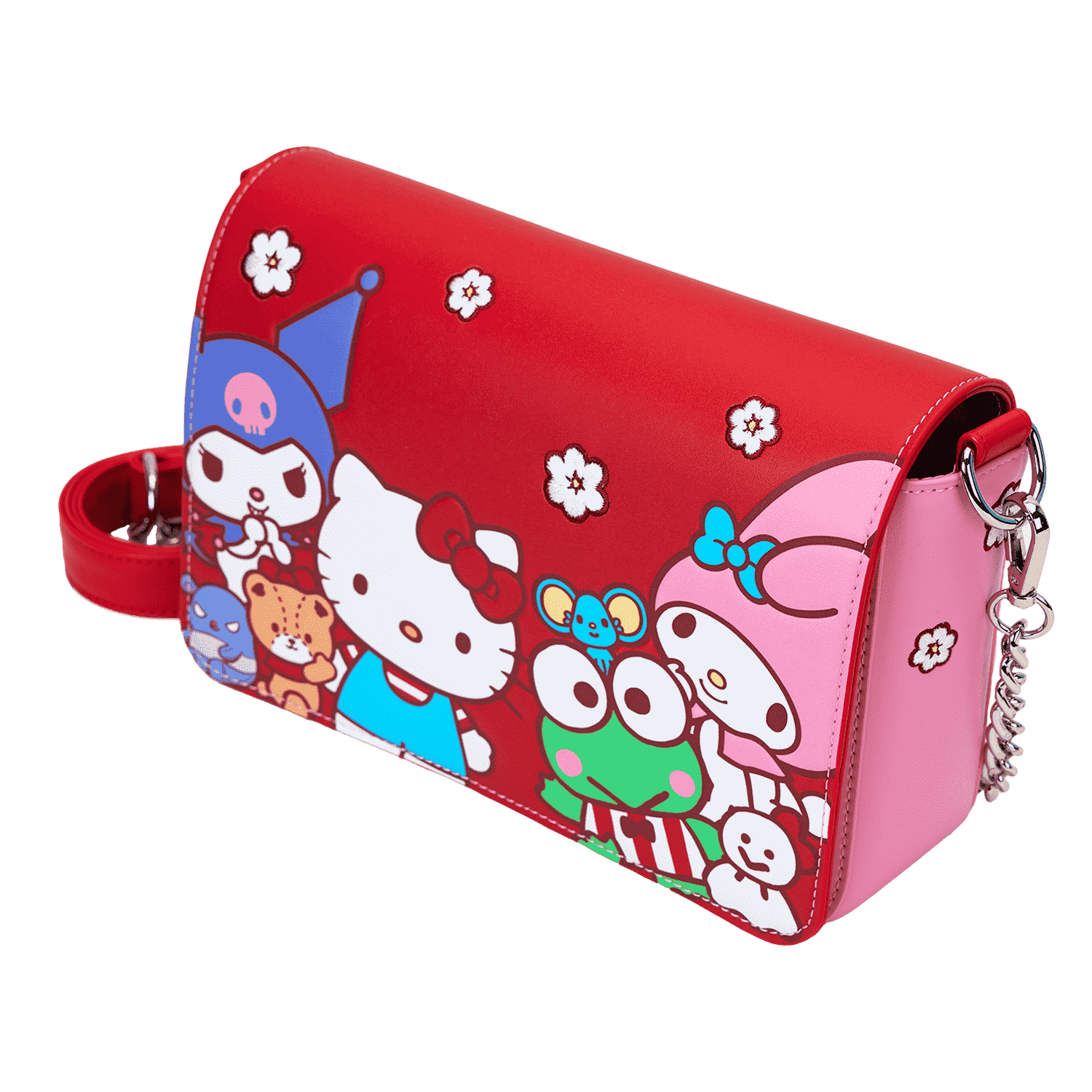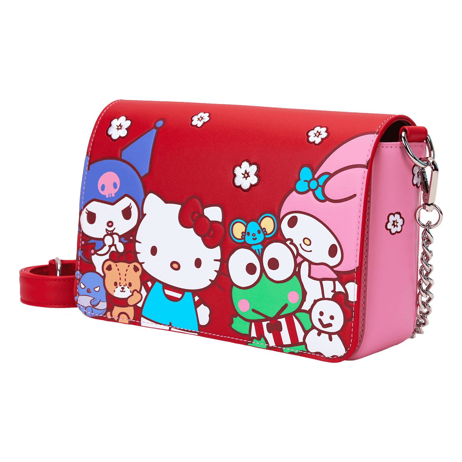 Hello, sweet blossoms! Stop and smell the flowers in style with this Hello Kitty™ and Friends crossbody bag, featuring a sprinkle of embroidered blooms. Sanrio fans, you’ll find adorable prints of fan-favorite characters and their buddies. Hello Kitty and Tiny Chum appear on the front flap, along with Keroppi with Teru Teru (Ruby), My Melody with Flat, and Kuromi with Baku. Turn the bag around, and you’ll find Cinnamoroll with Bear—and Pompompurin with Muffin. Color-blocking in pink and red adds a brilliant touch. There’s plenty of room inside this bag to secure your daily essentials and share smiles wherever you go.